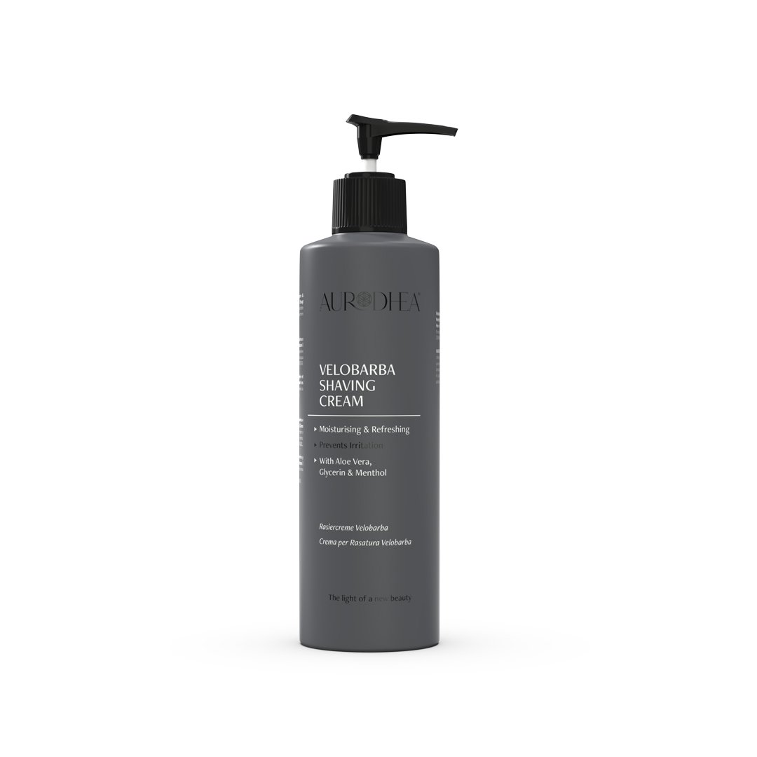 La crème Velobarba Aurodhea, fraîche et douce, adoucit la peau et permet à la lame du rasoir de glisser en douceur, garantissant un rasage rapide et délicat.